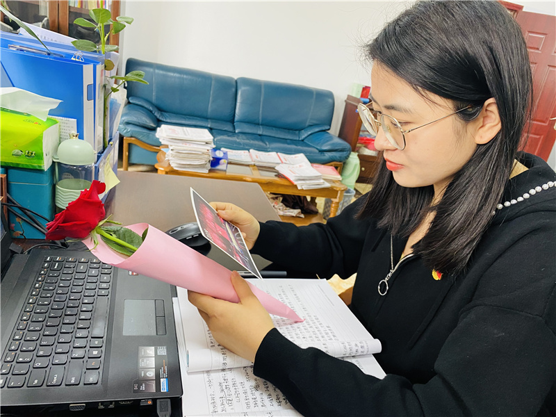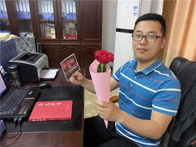 红玫瑰代表着爱的宣言,铭记于心的信仰。明信片中记录了党的百年历史大事记。收到玫瑰花和党史明信片,党员程志刚惊喜地说:“原来学习党史还可以如此浪漫!这张明信片我一定会好好保存!”