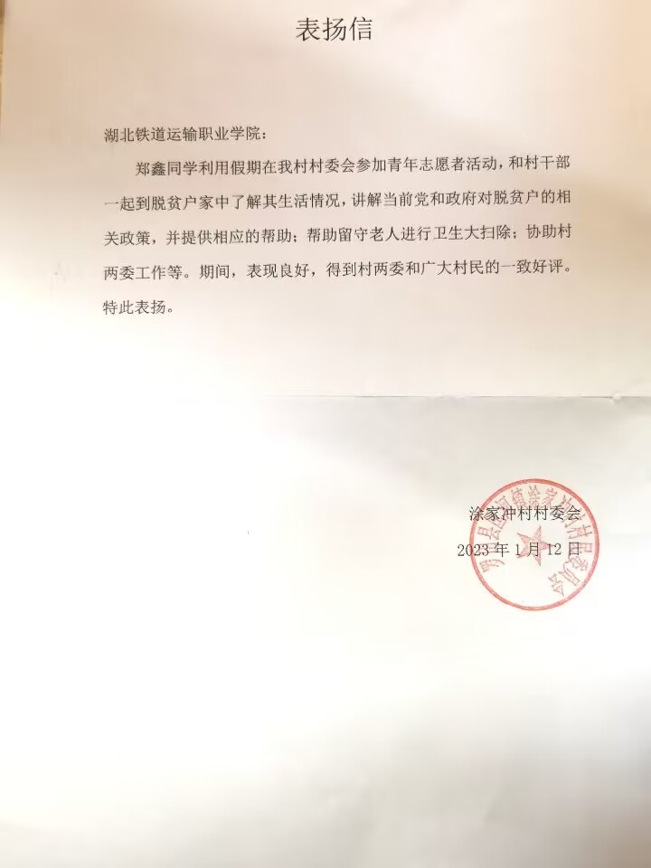 我系2021级武汉驾驶3班学生郑鑫利用寒假放假时间积极参加社会实践,主动到当地村委会担任志愿者,协助村委会处理一些日常事务,受到当地村委会高度赞扬。