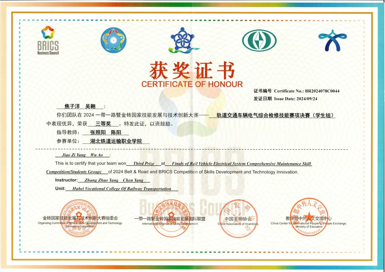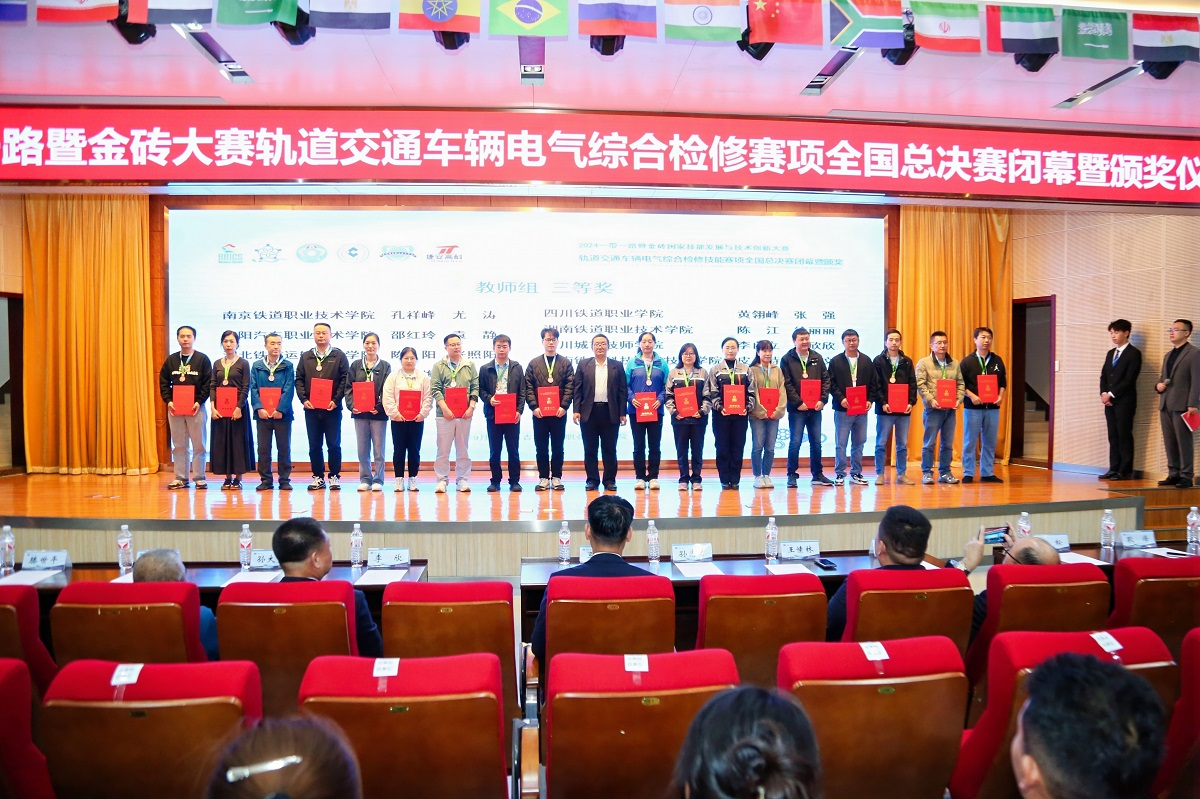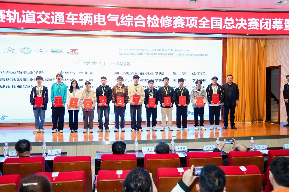 9月20日—24日,2024一带一路暨金砖国家技能发展与技术创新大赛轨道交通车辆电气综合检修技能赛项比赛在吉林铁道职业技术学院举办,共有来自全国20个省、自治区、直辖市的30余所院校,涵盖学生与教师共65支队伍,近200名师生参加。beat365教师张照阳、陈阳荣获教师组全国三等奖,学生焦子洋(2022级铁道车辆1班)、吴翱(2023级铁道车辆2班)荣获学生组全国三等奖。