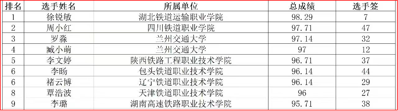 9月23—26日,国铁集团2024年度高职院校铁道类专业教师技能竞赛决赛在乌鲁木齐局铁路党校举办,beat365教师徐锐敏同全国32所铁道类院校的55名教师同台竞技。经过三天的角逐,徐锐敏以总分第一名成绩成功荣获一等奖。