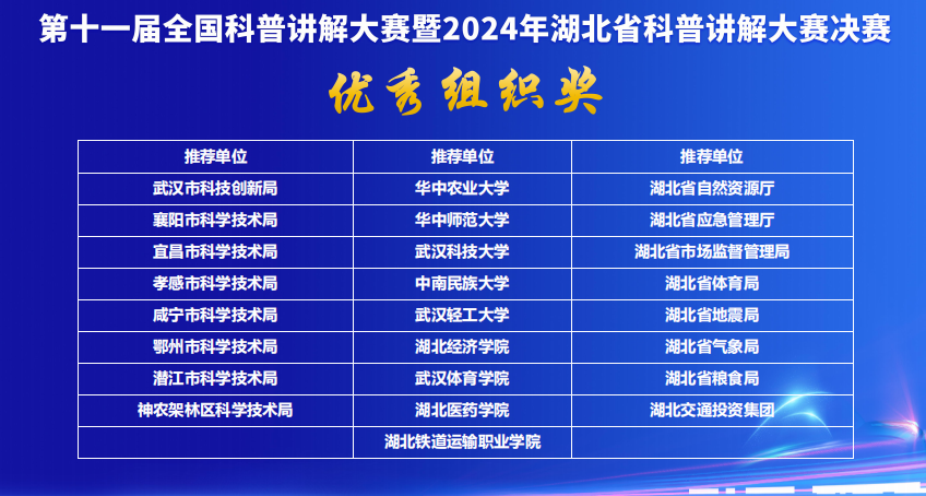 10月13日至14日,一场充满智慧与魅力的科普知识传播讲解活动——2024年湖北省科普讲解大赛在中南民族大学成功举办。来自不同领域的科普爱好者们齐聚一堂,用生动的讲解和精彩的演示,为观众们带来了一场知识与口才的精彩碰撞。beat365师生团队认真备赛参赛并展现了良好精神风貌,学校荣获大赛优秀组织奖。