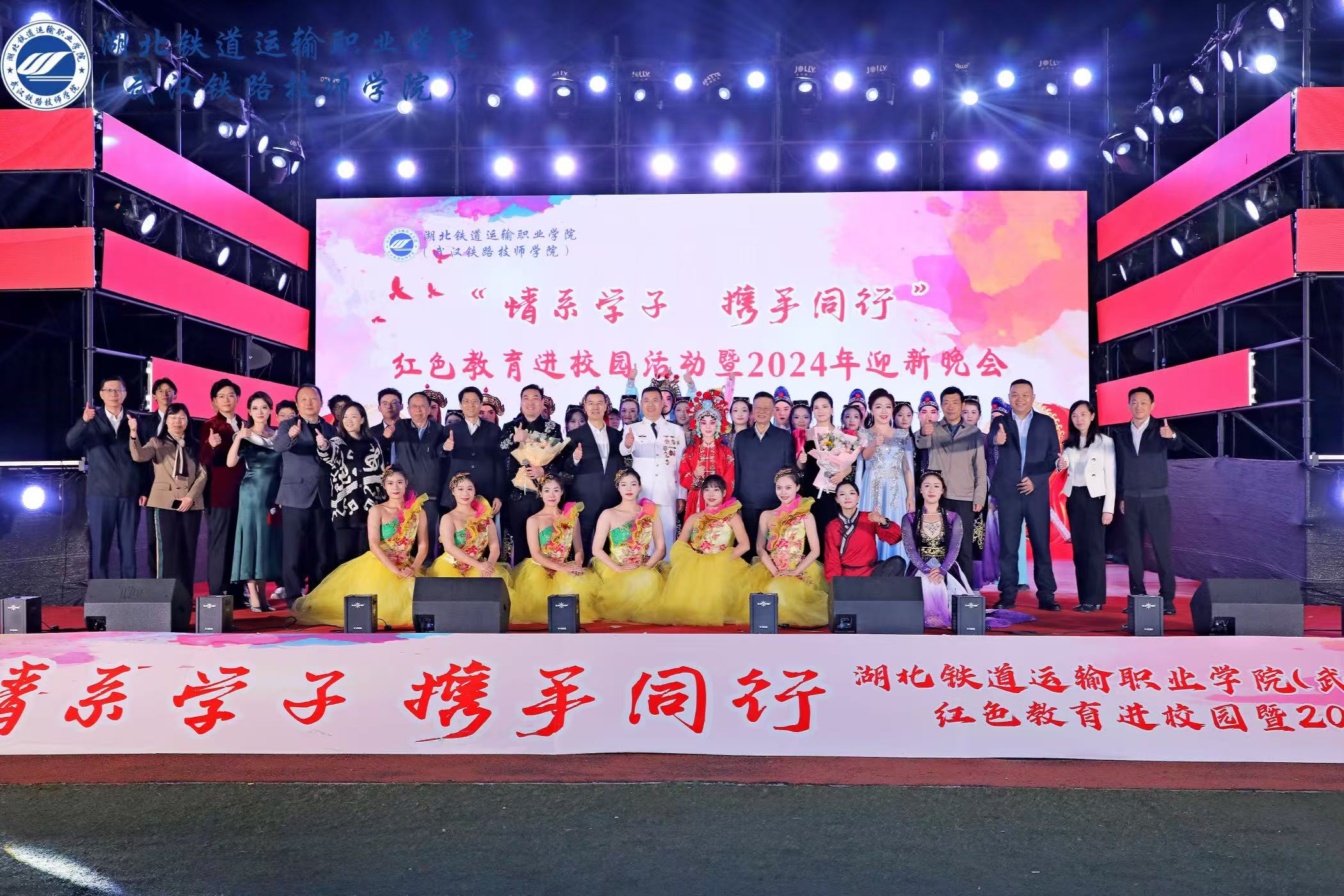 10月23日晚,由省直机关关工委、省人社厅关工委、省演艺集团主办、beat365中文官方网站(武汉铁路技师学院)承办的“情系学子 携手同行”红色教育进校园暨文艺演出活动在学校操场举办。省直机关关工委常务副主任李纪刚,省直机关关工委副主任江国钧,省直机关关工委秘书长项大鹏,省人社厅二级巡视员黄诚,省人社厅机关党委专职副书记、厅关工委副主任杨萍,省人社厅离退休干部处处长、厅关工委副主任纪方斌受邀参加活动。学校党委班子成员出席活动,学校各处室、系部党政负责人,教师代表与2024级全体新生共同观看演出。