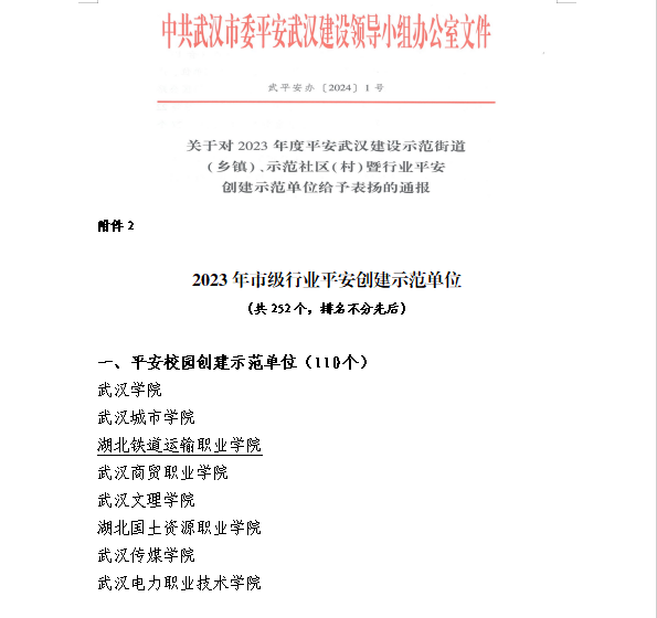 学校被中共武汉市委平安武汉建设领导小组授予武汉市平安校园创建“示范单位”荣誉称号。
