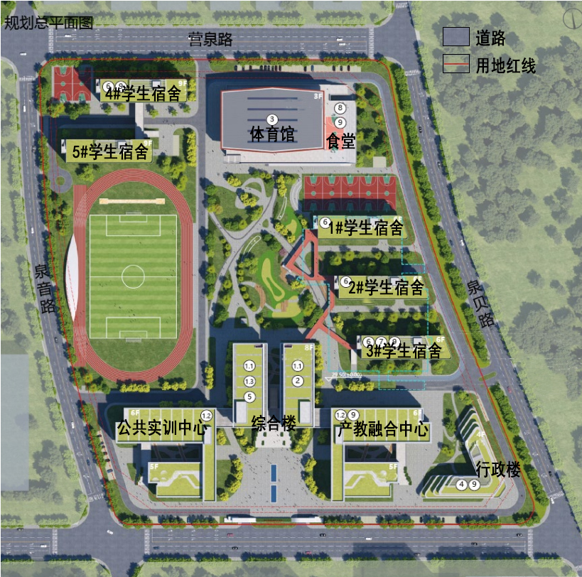 根据规划方案,该项目将建设学生宿舍、食堂、体育馆、综合楼(含教学楼、图书馆、学术报告厅等)、产教融合中心、公共实训中心、行政楼等,同时配套建设地下车库、人防设施,室外运动场地和校园基础设施等。
