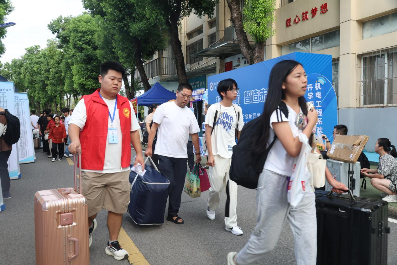 迎新期间,学校围绕“便捷、安全、有温度”核心目标,全方位优化迎新服务流程:校门口设置“新生报到引导岗”,志愿者们举着院系引导牌主动帮新生提行李、答疑解惑;报到点位内,各职能部门开设“一站式服务窗口”,从身份核验、档案提交到校园卡激活,流程清晰高效,避免新生多跑路;针对远距离、乘坐公共交通报到的新生和家长,学校安排“爱心接驳车”从车站直达校园;校园内随处可见的迎新指引牌、免费供应的饮用水与应急药品,让新生与家长刚进校园便感受到家的温暖。