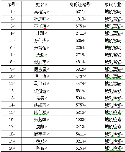 经综合考核,现公布2016年苏州地铁订单班录取名单。以下被录取的考生务必于7月28日至8月1日将学费共计6620元转入学校账户: