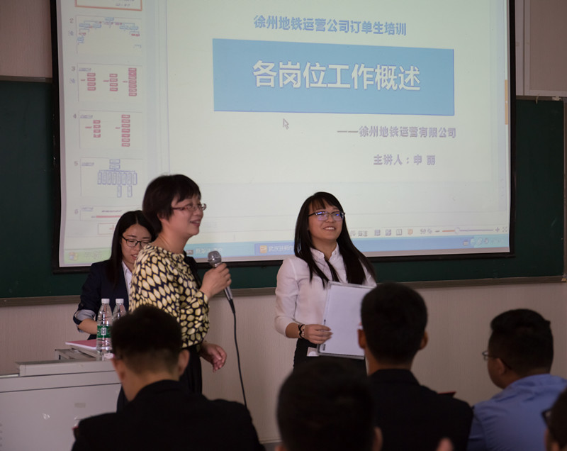4月19日上午,徐州地铁公司客运部信号工程师吴婷婷、申丽一行两人在教学楼2503教室对2015级徐州地铁订单班的学生进行授课讲座。beat365招生办事处主任何巍以及徐州订单班的辅导员现场陪同。