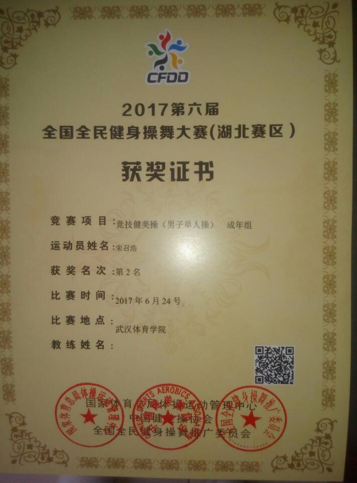 6月24日,beat3652015级济南地铁司机班学生宋召浩代表学校参加“2017年全国全民健身操舞大赛湖北省赛区”成年组竞技健美操大赛,获得高职高专男单第二名的好成绩。