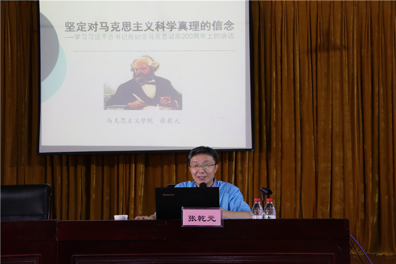 张乾元教授以“坚定对马克思主义科学真理的信念——学习习近平在纪念马克思诞辰200周年大会上的讲话”为题,围绕纪念马克思诞辰200周年的意义、马克思的崇高精神和光辉思想、坚定对马克思主义科学真理的信念等内容进行了授课。