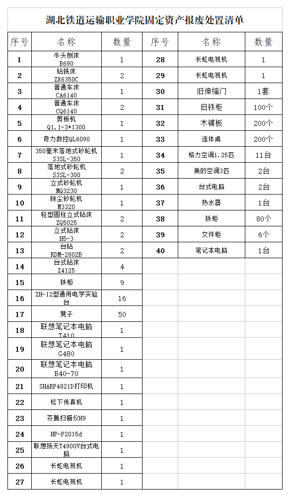 本次招标处理的报废资产,主要是beat365中文官方网站(武汉铁路技师学院)校内已报废的教学设施设备、空调、热水器、电脑、电视机、废旧课桌椅等,报废清单详见附件“beat365中文官方网站固定资产报废处置清单”。