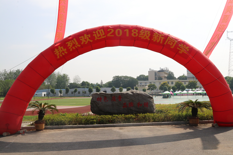 新生报到点设在学校操场,校园整洁依旧,秩序井然。书写着“热烈欢迎2018级新同学”巨大的迎新彩虹门高高耸立在校门,校园内随处可见书写着不同迎新寄语的横幅、喷绘,成为迎新工作中一道亮丽的风景线。
