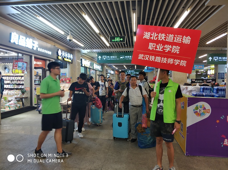 工作人员和志愿者在火车站迎新点为新生提供服务