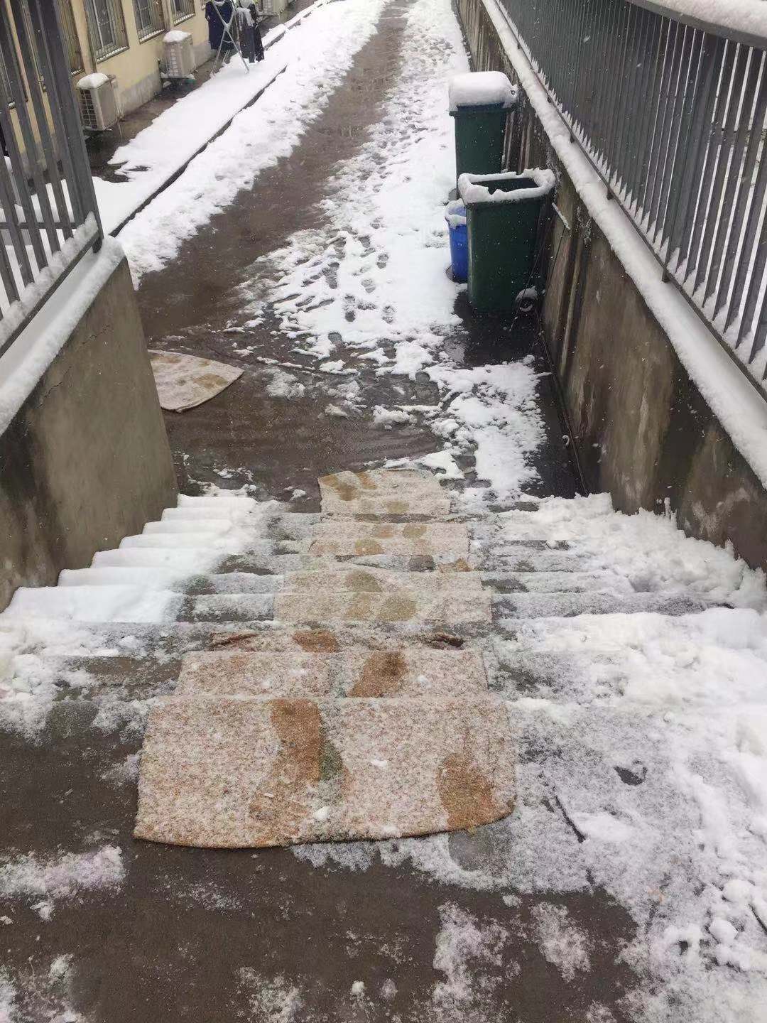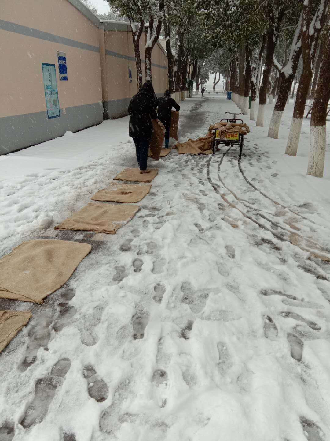 早上7点钟,当大家还在温暖被窝里的时候,后勤的师傅们就开始清扫积雪、铺设草垫,为师生出行提供便利。