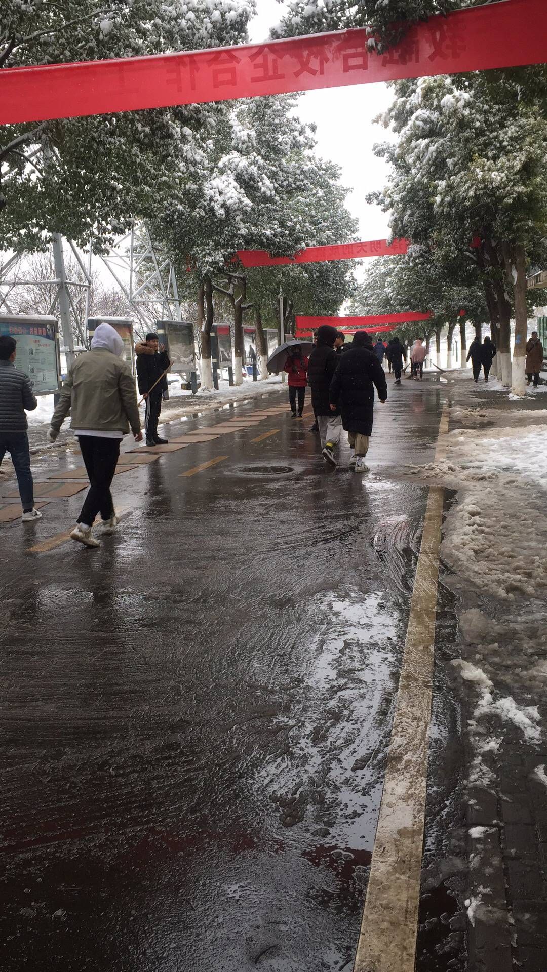冒着纷纷扬扬的大雪,在校师生自发行动起来清扫校园积雪。
